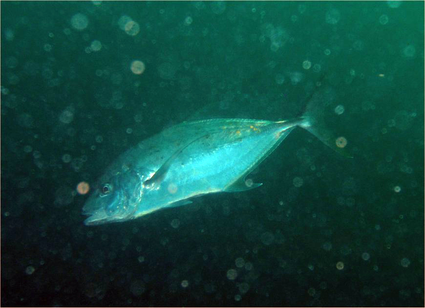 銀色に輝く体に黄色小斑点があって腹部は白っぽく、「日本産魚類検索 全種の同定」(東海大学出版会)に『本種はきわめて稀な種類で、琉球列島ではごく稀に漁獲される程度である。』と記されているアンダマンアジかと思ってワクワクしたのですが、いくら何でもありのパプアニューギニアだからってそんなに甘くはなかった…