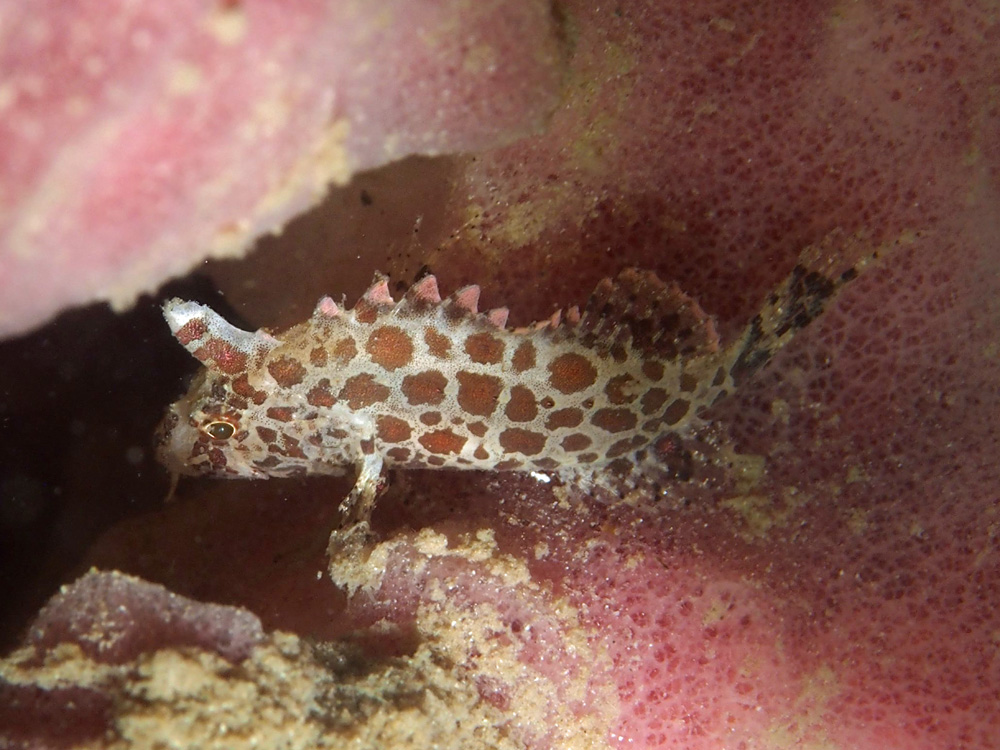 撮影 2013/02/11 インドネシア バリ島 掲載 ⇒フサカサゴの仲間 お世話になったサリ・ダイブ&リゾートでは体模様から「キリンちゃん」と呼んでいました。 サンゴの隙間の奥の方にジーっとしているので、この角度からしか撮れませんでした。そういう事情なので、これだけ写っていれば、ボクとしてはグッジョブなのでした。