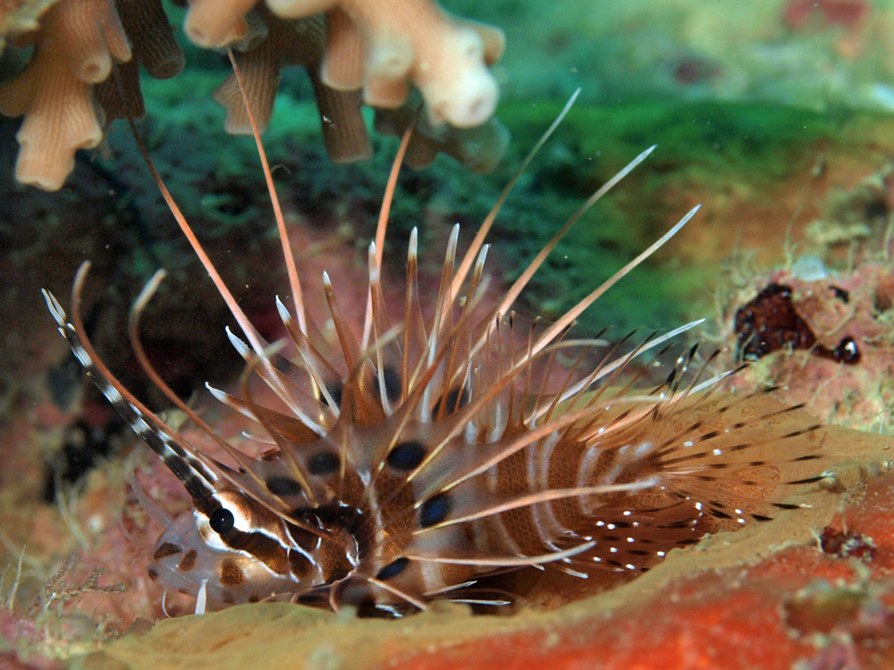 サンゴの奥に隠れていました、ジーっと動かないで。成魚は毒針を持っているせいか、威張って中空から周囲を睥睨している感がありますが、幼魚は可憐でいたいけな風情たっぷりで、できることならほおずりしたいくらいのかわいさでした。