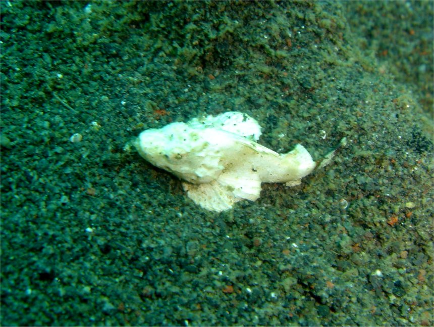 幼魚。5cmほど。成魚ほどではないにしても、早くもゴツゴツとした不恰好な体型になりつつあります。砂地のくすんだ色の中に白色なのでとても目立っていましたが、危険じゃあないんでしょうか。