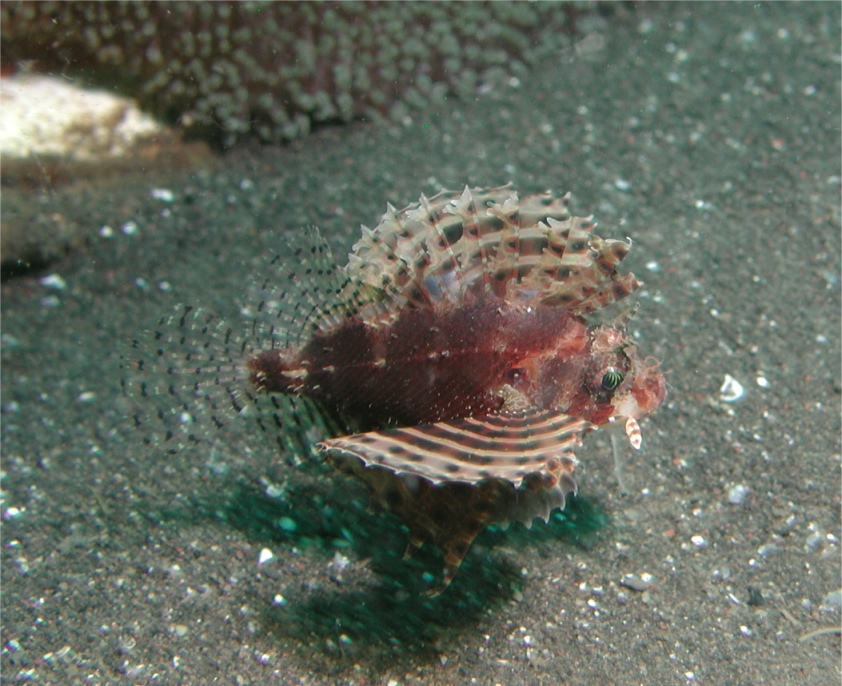 幼魚。幼魚だというのにダイバーが近づいても怖がる様子もなくゆったりと浮遊していました。こういう魚は写真が撮りやすくてウレシイのですが、あとで『日本の海水魚』を見たら「鰭の棘に強い毒があり、刺されると危険」とありました。なるほどゆったりしているのはそういうわけですね。