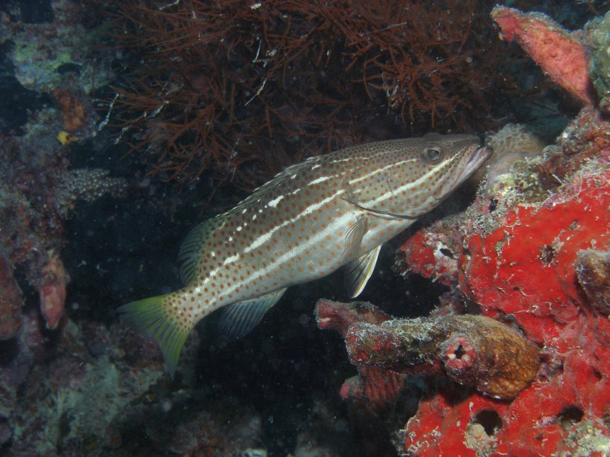 この魚は1828年に論文発表されたのですが、幼魚が成魚とかなり異なる模様であるために、1838年と1855年の2回も幼魚がアズキハタとは別種として誤って論文発表されています。分類学の世界もたいへんなんですね。