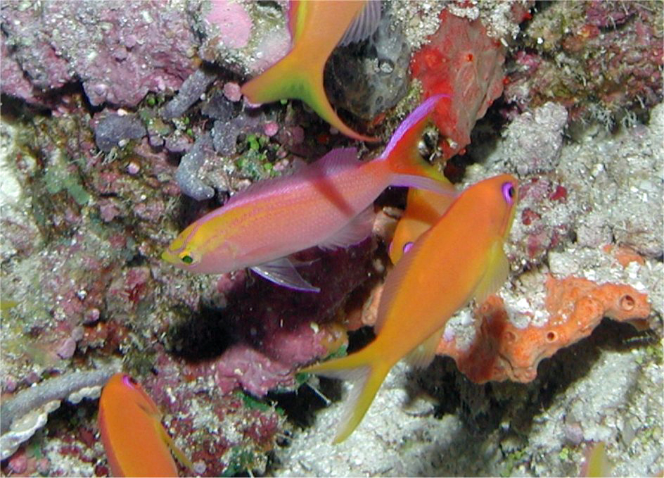 右横にいるのがPseudanthias ignitus(英名 Indian flame anthias)の雌です。こちらの雄は背鰭がカッコイイのですが未だ写せず。
