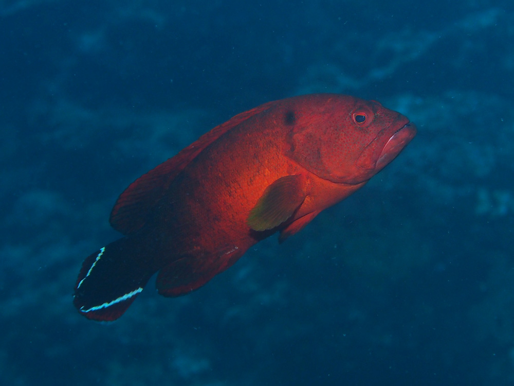 撮影 2013/01/31 沖縄県 沖縄島 掲載 2016/06/14 ⇒ハタの仲間 赤茶色タイプのニジハタが撮れたので追加しました。こっちの方がよく見かける気がしますが、遠くからでも目立つからでしょうか。不敵な面魂であたりを睥睨しています。