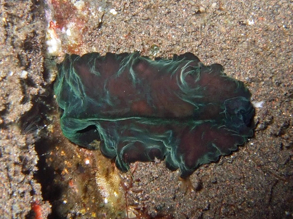 追記 2016/01/22 『ヒラムシ』 小野篤司 (2015年初版 誠文堂新光社)がPseudoceros bolool について「背面はほぼ黒色でビロード状、斑紋は認められない。」とあります。ボクの写真は黒ではなくて濃緑色ですが、その色具合は同書掲載写真とほぼ完全に一致しています。ただ、体長が20mmとなっており、ボクが見た個体は軽く50mmを越えていたのでその点だけが大きく異なりますが、ヒラムシの場合はサイズにかなりの幅があり、許容範囲であろうと見なしてPseudoceros boloolとしました。
