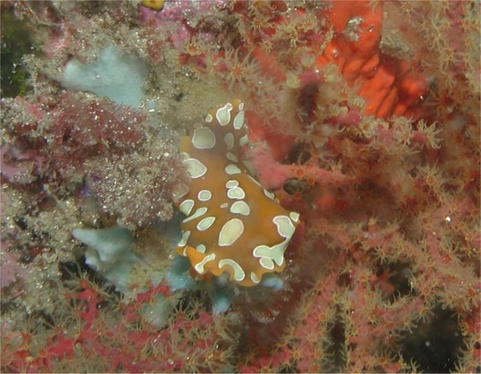 ガイドがこれを見つけて、ボードに”新種のウミウシかも!”と書き、半信半疑ながらも期待して盛り上がったのですが、あとで現地サービスのスタッフの方にこれを見てもらったら、”ン?これヒラムシじゃないの?”で一件落着。
