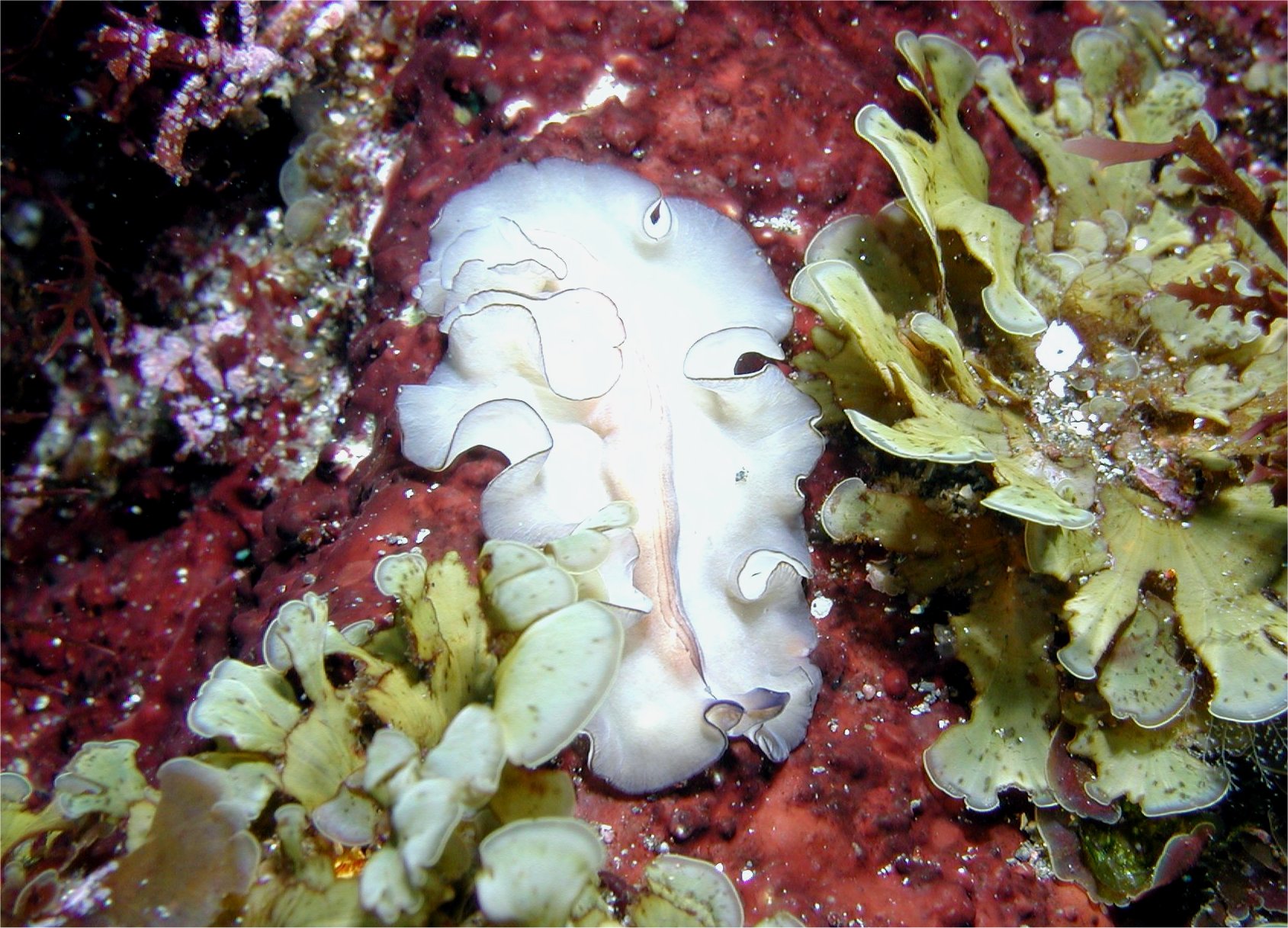 露出オーバーで本来の色が分からなくなっている恐れが大きい1枚です。このヒラムシも当然のように種不明ですが、白っぽいフレアスカートをひらひらさせなている姿はなかなか優雅な趣がありました。先端部分を2箇所くるっと巻いているのはウミウシの触角の擬態なんだと思います。