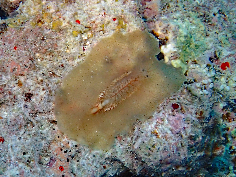 『ヒラムシ』 (小野篤司 初版 2015年 誠文堂新光社) 42ページ下段にパラプラノケラ属の1種3として掲載されています。右側に黒くて小さい触角があり、その後方に葉脈の模様のようなものが見えますが、これは模様ではなくて黄褐色の腸が透けて見えているとのことです。なんせ平べったい体ですから、腸だろうと何だろうと透けちゃうんですね、納得。
