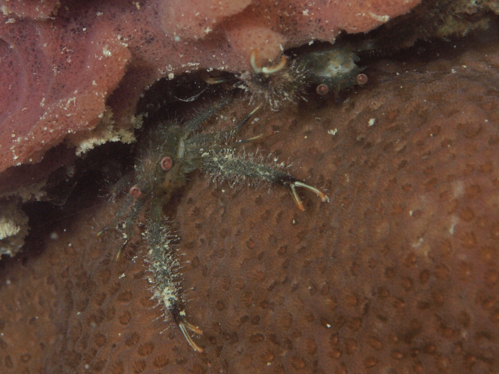 和名があるかもしれないので、この学名でネット検索すると、いくつかのスジテコシオリエビとしているページがヒットしました。また、『エビ・カニ ガイドブック A -沖縄・久米島の海から-』 川本剛志/奥野淳児 (初版 2003年 阪急コミュニケーションズ) のP.156にはG. tanegashimaeはスジテコシオリエビG. spinosorostrisの新参異名だと書かれています。 ところが、両書の掲載写真は似ても似つかぬ姿です。ん?新参異名のはずなのに、どうなってるの?