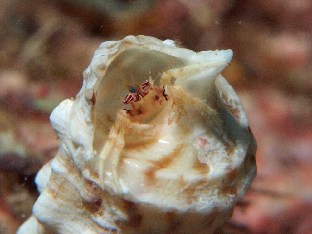 眼の柄がとても珍しいと思います。小豆色の縦縞が何本も走っているなんて見たことないし、ヤドカリ図鑑を調べてもそんな種は見当たりません。