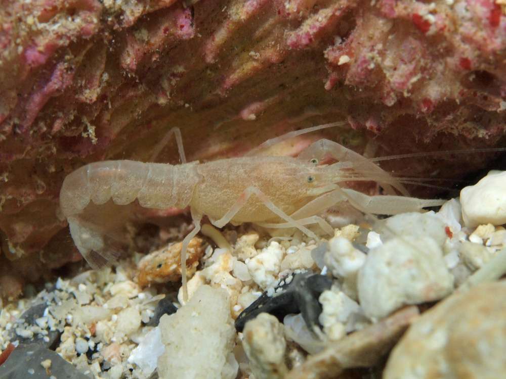 撮影 2012/10/03 沖縄県 沖縄島 掲載 2015/11/27 ⇒異尾類の仲間 普段はがれきの陰でひっそりと生活しているはずですが、運悪く人間に見つかってしまいました。(生活を乱しちゃってどうもスミマセン。) 全身が白っぽい体色ですが、歩脚のほんの一部にピンクが入っています。お洒落も遠慮がちにひっそりとやっているんですねぇ。