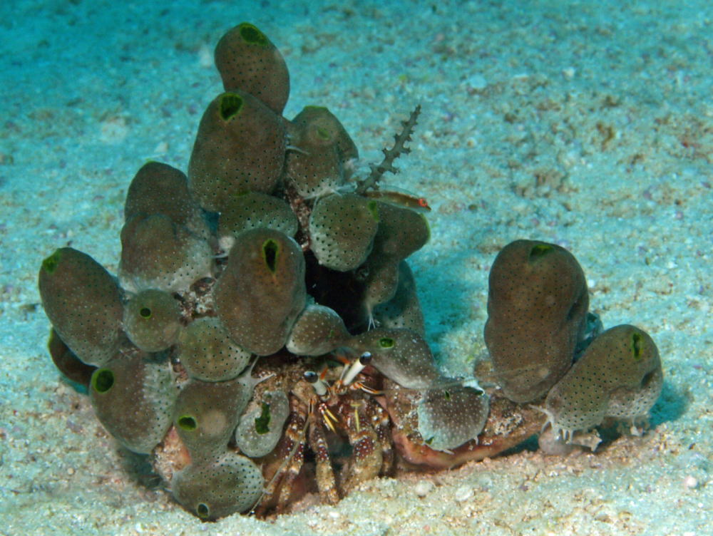 ハゼまで住みついちゃってます。このハゼさんは自分がヤドカリの殻の上で生活しているのを知っているんでしょうかね? 「自動であちこち移動して便利だなあ」なんてね。