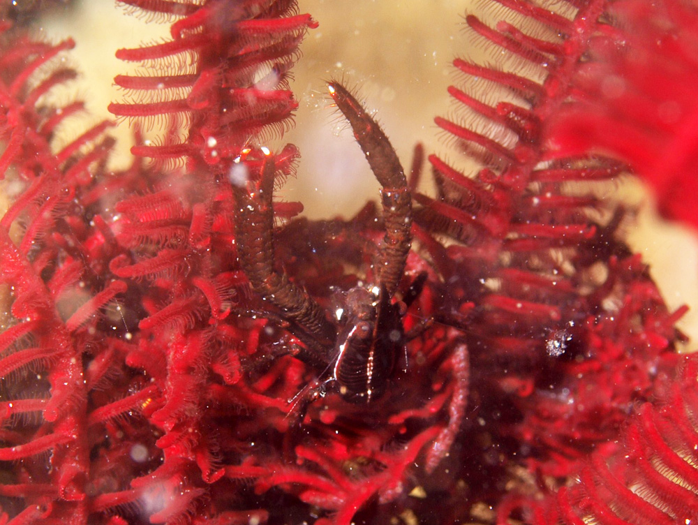 撮影 2009/10/01 インドネシア バリ島 掲載 2014/08/18 ⇒異尾類 宿主にあわせてか濃厚な赤です。エンジ色と言ったほうが近いかな。 これまた乏しい資料を探しても当然のごとく該当種は見当たらずに不明でした。コシオリエビ図鑑---なんてマニアックな図鑑は絶対に出ないよなー。哀しい。