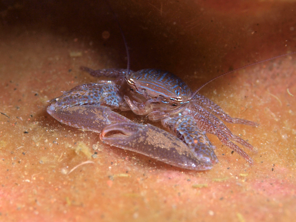 生息場所と体型からするとウミエラカニダマシ属としていいと判断しました。異尾類-29の写真の白い個体は眼の柄からするとこちらと同種です。一方が雄で他方が雌ということでしょう。