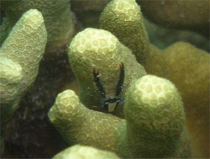 コシオリエビ属の一種だろうと思うのですが確証がありません。眼と足に黄・黒・青の模様が入っていて抜群のチャーミングさでした。