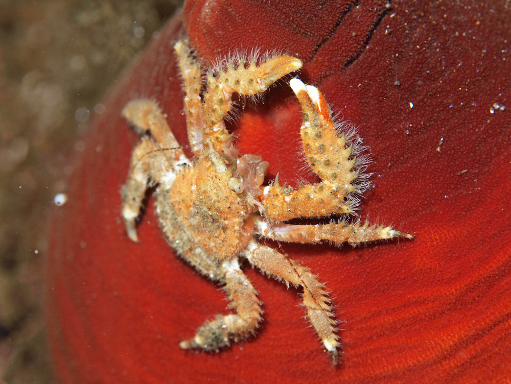 『海の甲殻類』 峯水亮/武田正倫/奥野淳児 (2002年初版2刷 文一総合出版)によると「昼夜ともに表には出てこない。」というのに昼のダイビングで出会うことができてラッキー!