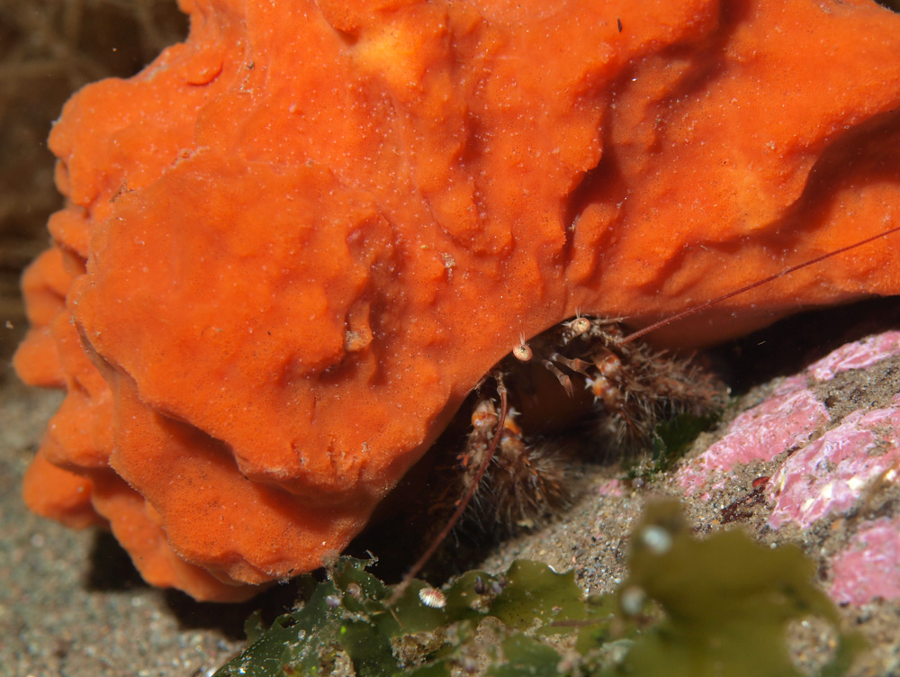 貝殻ではなくて巨大なカイメンを背負っていますが、それがこの種の成体の特徴です。重いだろうにねえ。ご苦労さま。