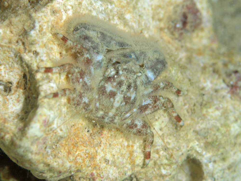 撮影 2012/11/02 沖縄県 沖縄島 掲載 2015/12/31 ⇒異尾類の仲間 被写体がうすボンヤリと写っていますが、これはピントが合っていないのではなくてびっしり生えた毛が体の輪郭を曖昧にしているためです。和名通りに毛深いんですね〜。