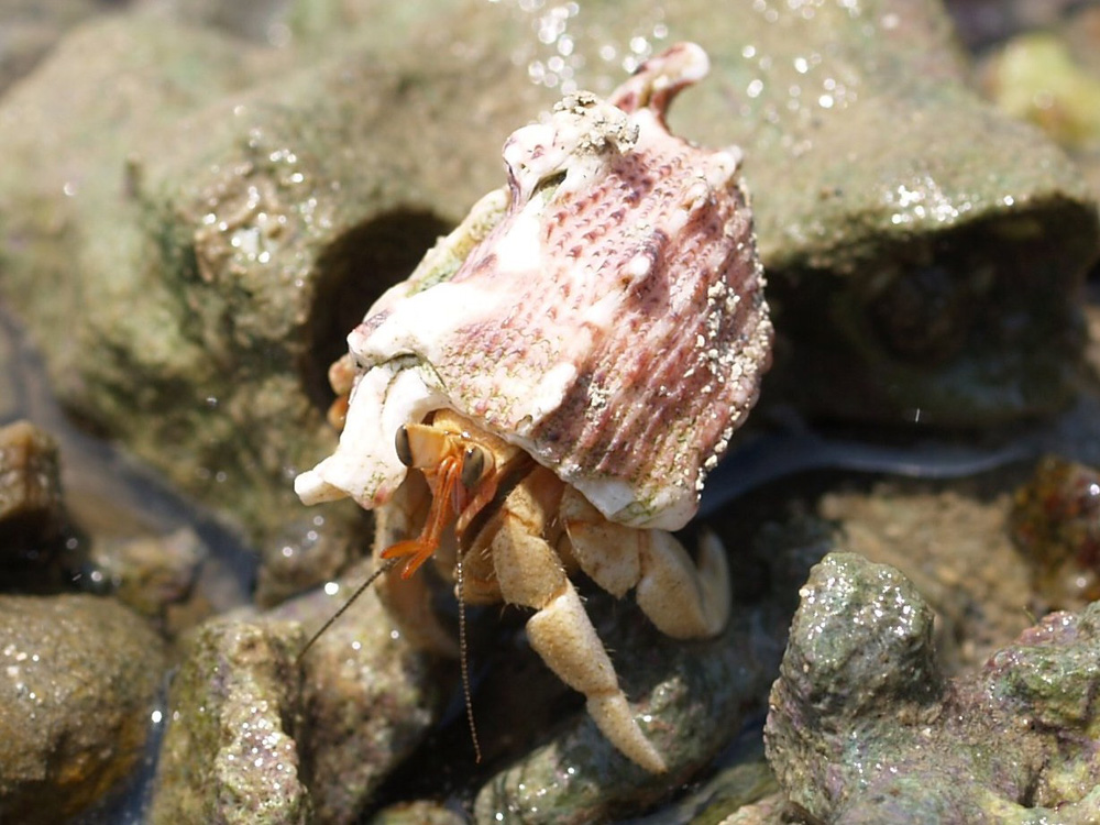 海岸をぶらぶらしていたらこのヤドカリも沢山ぶらぶらしていました。人間に対する恐怖心が全然ないようで、体を引っ込めることも、逃げることもしないでのんびりとくつろいでいました。いいなあ。