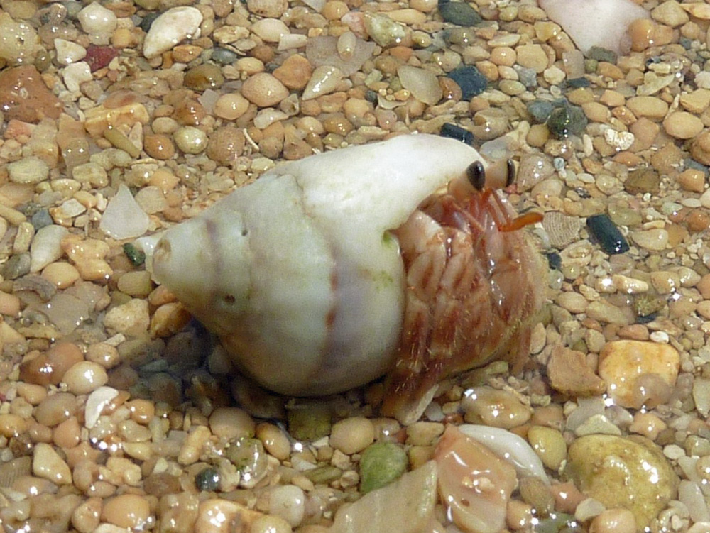 貝の長さが約1pあるかないかで、中の住人はとても小さくて、眼柄の形や体色からナキオカヤドカリとしましたが、よく似ているムラサキオカヤドカリの幼体である確率もいくらかありそうです。