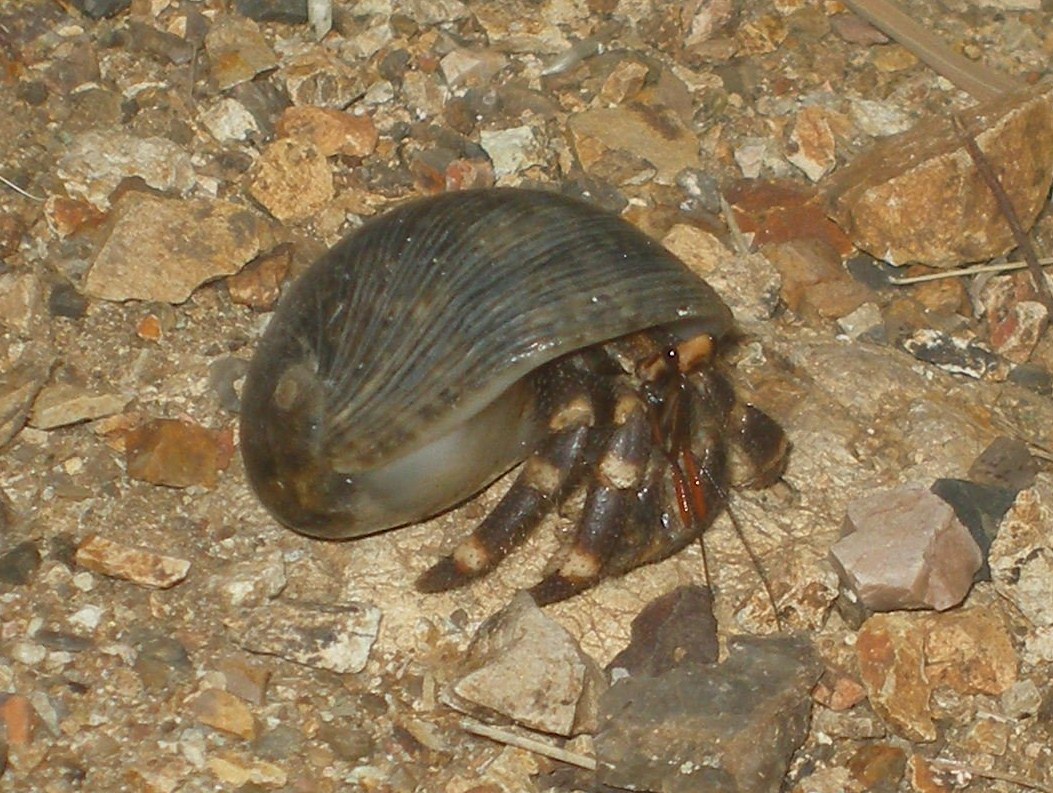記憶があいまいなのですが、水際の陸に居たような覚えがあります。その記憶に間違いがなければオカヤドカリの一種かもしれません。