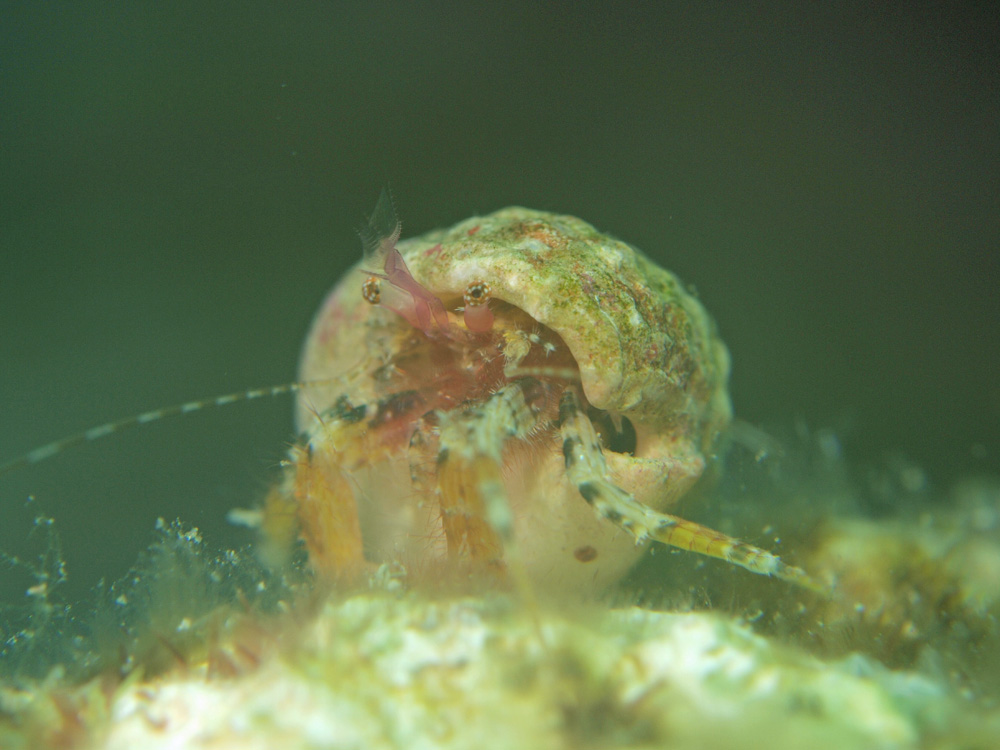 『ヤドカリ』 有馬啓人 (2014年初版 誠文堂新光社)のオキナワイトヒキヤドカリの解説では、眼柄と第1触角がピンク色のところはぴたり一致しますが、歩脚の模様は異なります。ただ、「ハサミ脚、歩脚には色彩変異が見られ、前節から先が明るい茶色になる個体もいる。」とあって、それに該当しないとも言えないうえに、ほかにそれらしい種類が見当たらないので疑問符付きのオキナワイトヒキヤドカリとしました