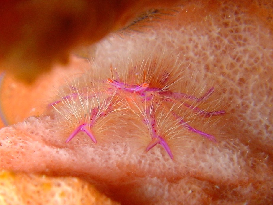 カイメンと共生しているのだそうですが、カイメンと同系統の色のうえに、これまた小指の先くらいの大きさで、肉眼でもよく見えず、あてずっぽうに何枚か撮ったら、運良く1枚だけ入っていました。