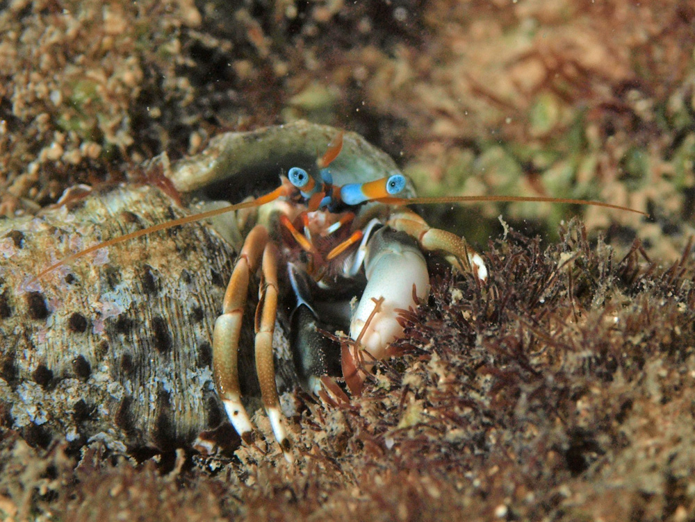 撮影 2008/10/17 沖縄県 石垣島 掲載 2013/05/10 ⇒異尾類・シャコの仲間 サンゴ礁の礁原を散歩していると時々見かけます。眼と眼柄の空色がキレイです。歩脚の先端部が白で、そこに黒っぽい斑点と斑紋があるのが特徴です。