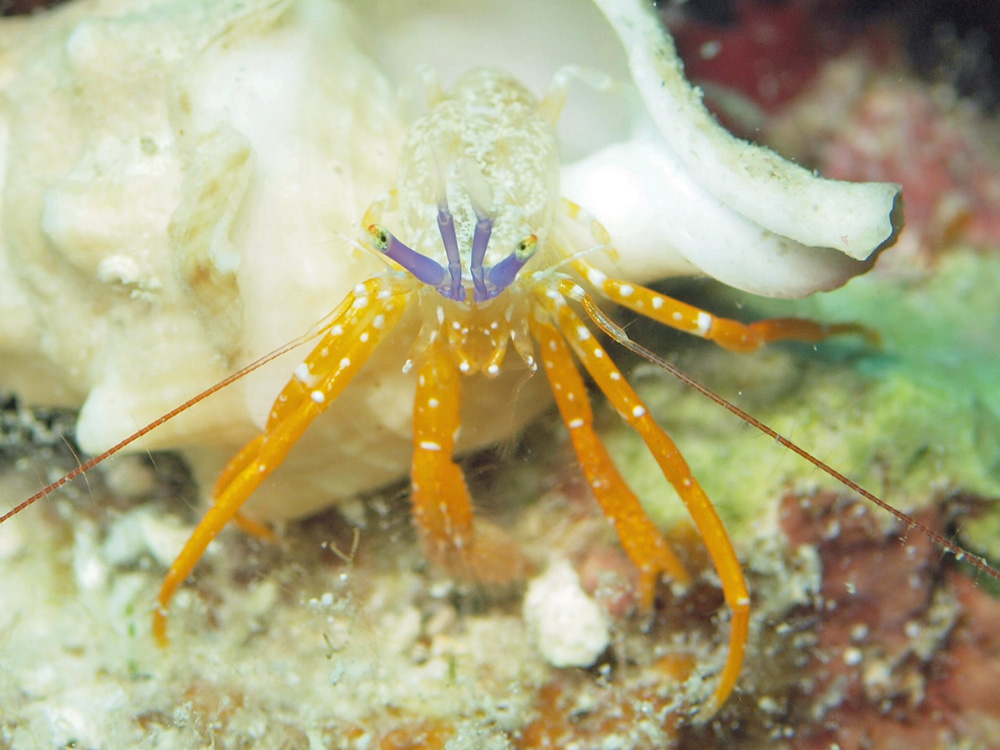 ちょっと見では、脚が黄色くて白斑があるところや、第1触角が紫色であるところなどがフルセゼブラヤドカリと似ていますが、こちらは脚の関節部以外にも白斑があり、