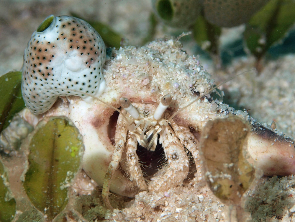 わりあい地味なヤドカリさんですが、体に不釣り合いな大きな貝の住居を持っていて屋根には煙突もついています。おそらく海の中でもクリスマスにはサンタさんが訪れるのでしょう。