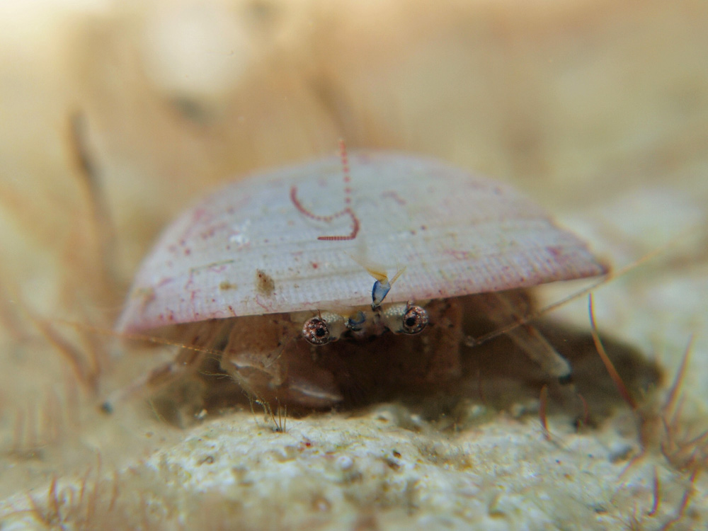 写真は大きく映っていますが実寸は背負っている貝の横幅が1pあるかどうかのオチビちゃんです。和名の通りですね。