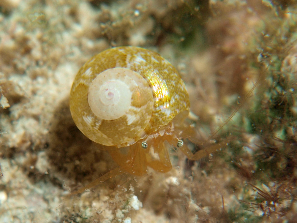 自分の体色と似た色合いの、しかも光沢のある貝殻を背負って、とてもお似合いです。