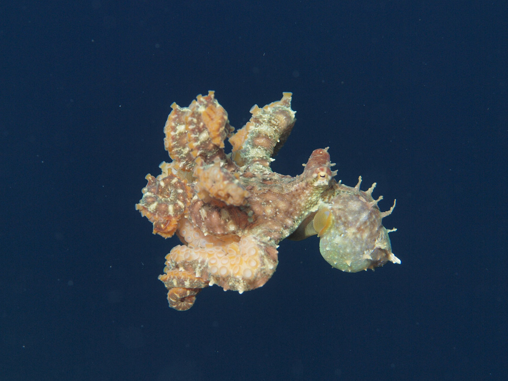ここに至るまでの経緯。ボクの存在に気づいて泳ぎだしたのですが、しつこく後をついてきます。そのうっとおしい存在を追い払うべく必殺の目くらまし技として真っ黒いスミを吐いたのでした。しかし、この存在にはまったく効果がありませんでした。