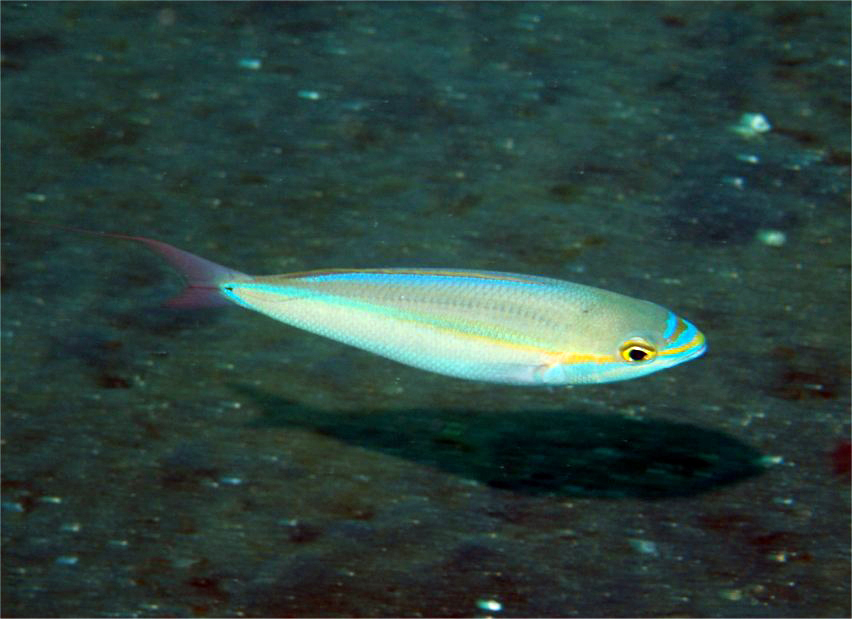 Pentapodus paradiseus というよく似た種類があって、違いは眼を通る縞筋がPentapodus porosus はオレンジ色で、Pentapodus paradiseus は茶色である点です。色はあまりあてにならないだけに、同定の手掛かりとしてはちょっとばかり気になりますが図鑑を信じて。