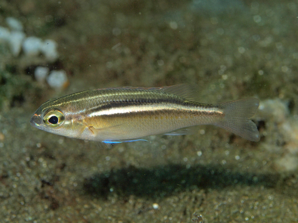 撮影 2014/02/09 インドネシア バリ島 掲載 2021/05/26 ⇒イトヨリダイの仲間 ホバリング中の幼魚(と言っても若魚くらいかな?)が撮れたので追加しました。銀白色の縦帯がまぶしく輝いています。