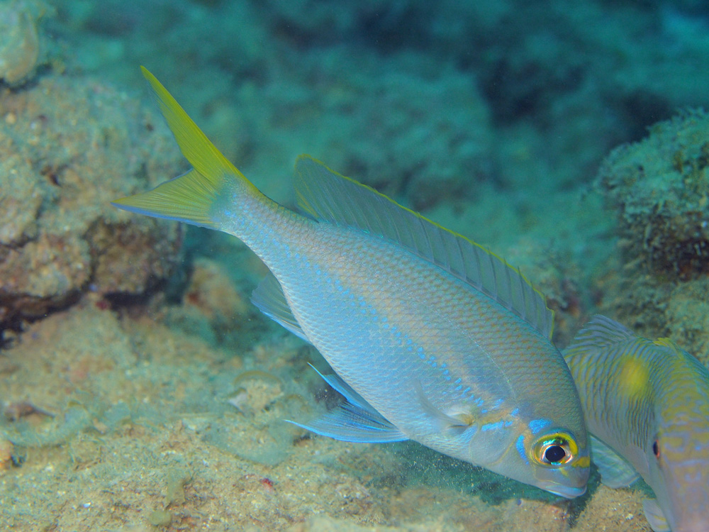 おそらく若魚です。体色の水色も黄色も純度が高くて、まだ世間の汚れに染まっていません。清々しいなあ。