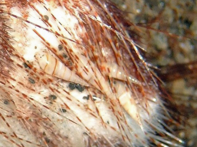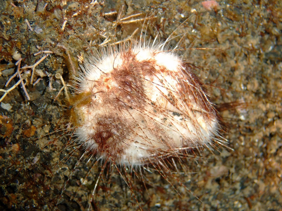 アカウニではなくてブンブクの仲間(オニヒメブンブクかな?)に取り付いています。ブンブクと色が似ていて見にくいのですがアップの写真の中だけで4個体います。きっと住み心地がいいんですね。