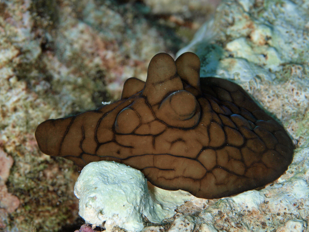 撮影 2008/12/05 沖縄県 石垣島 掲載 2013/06/03 ⇒貝の仲間 外套膜が全体を覆っていて殻が見えることはありませんが、半透明でカタツムリの殻のような形をしています。 それにしても、教えられなければ貝の仲間だとはちょっと思えない形です。この写真だと左側が頭部。