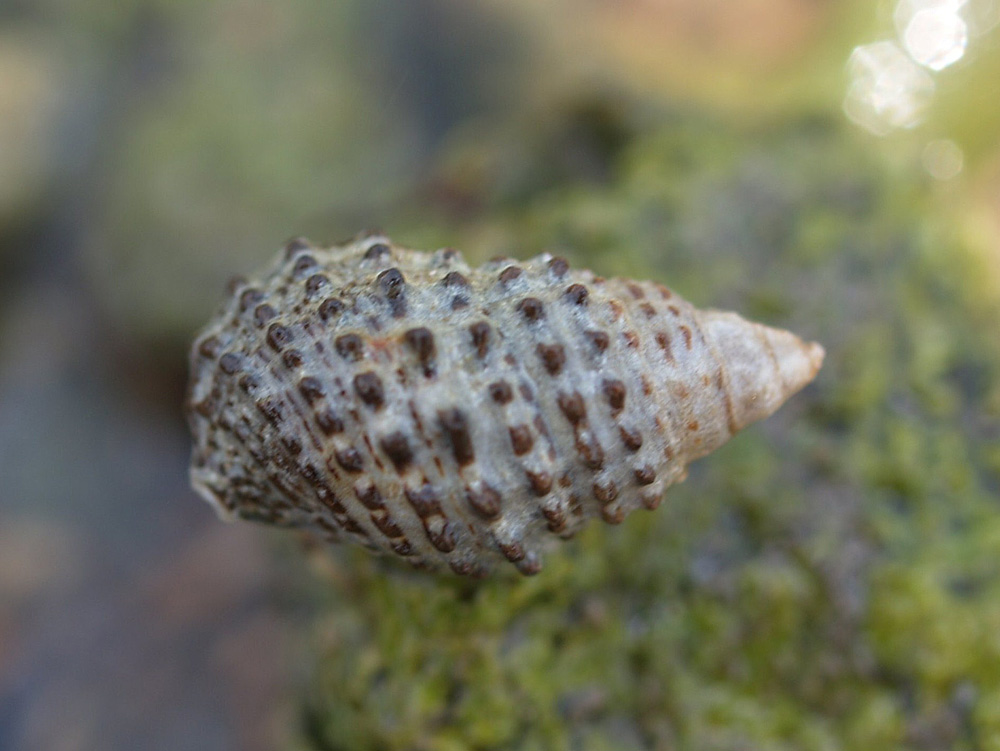 「日本近海産貝類図鑑」 奥谷喬司 (2000年初版 東海大学出版会)393ページには「潮間帯下部〜水深20mの岩礁域」が生息域と書いてありますが、この写真は湾奥の礁原で干潮時に撮りました。