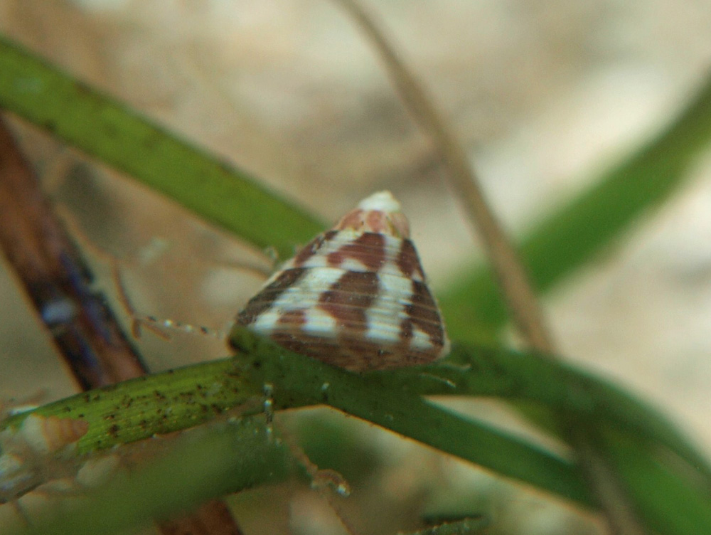 撮影 2009/06/09 沖縄県 石垣島 掲載 2013/12/23 ⇒貝の仲間 水中目視で1cmはなかったので、5o位でしょうか。 細い葉の上で綱渡りの練習をしていましたが、渡るスピードがあまりにも遅いのでいつまでたっても上達しないでしょう。