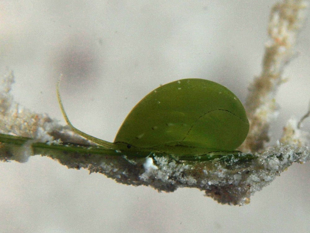 アマモ葉に乗っているところを撮影。水中目視で5mmでした。