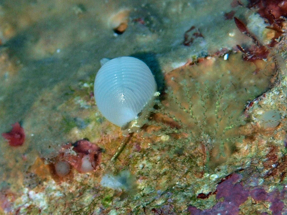 ツヤのある純白の殻の中央部に1本のくぼみがあります。