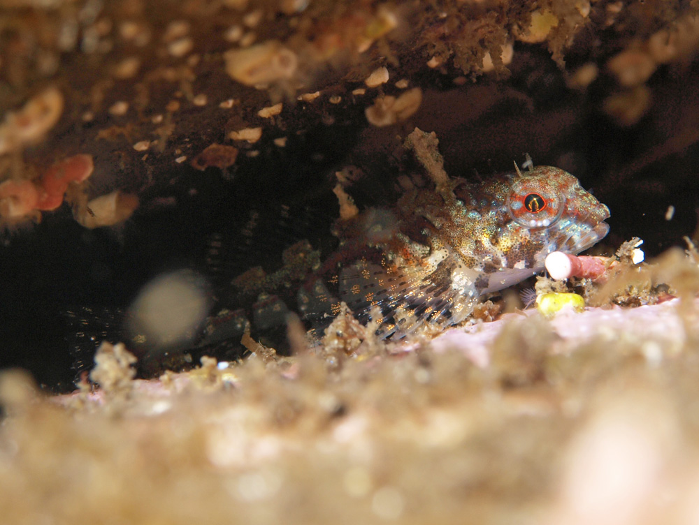 撮影時にはイソギンポの仲間だとばかり思っていましたが、後でガイドにニジカジカの幼魚と聞いて納得。成魚よりもこっちのほうが虹色に近い気がします。