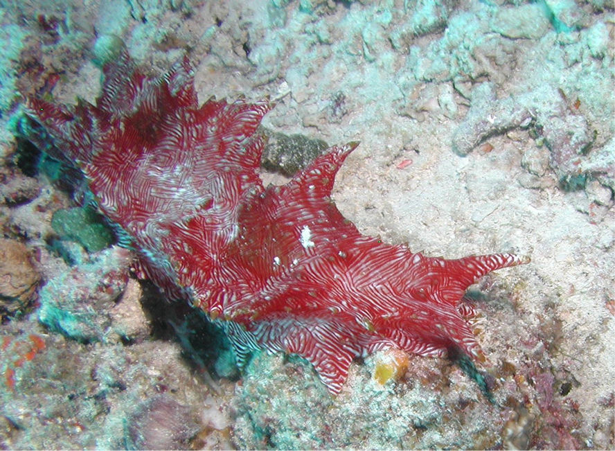 赤い縞模様が複雑に折り重なって織物の模様のように見えます。これが、あの、ナマコの仲間とはネー。こんなにきれいだと、ナマコのイメージとは重なりません。「じゃあなんだ?」と尋ねられたら、「超巨大ウミウシかも」と答えます。