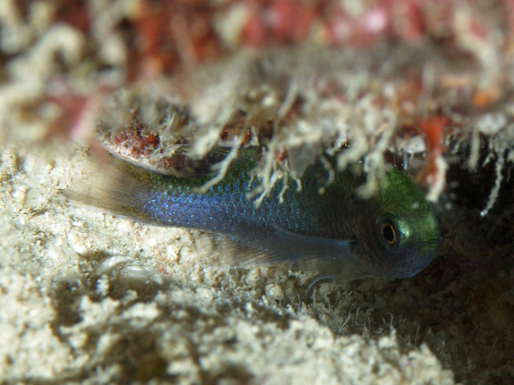 群れているときや、ハナダイに混じっているときは体色が変わるようですが、ナイトダイビングで撮った、背びれ側が輝く緑で腹びれ側が輝く青のこの神々しい色がベストだと思います。