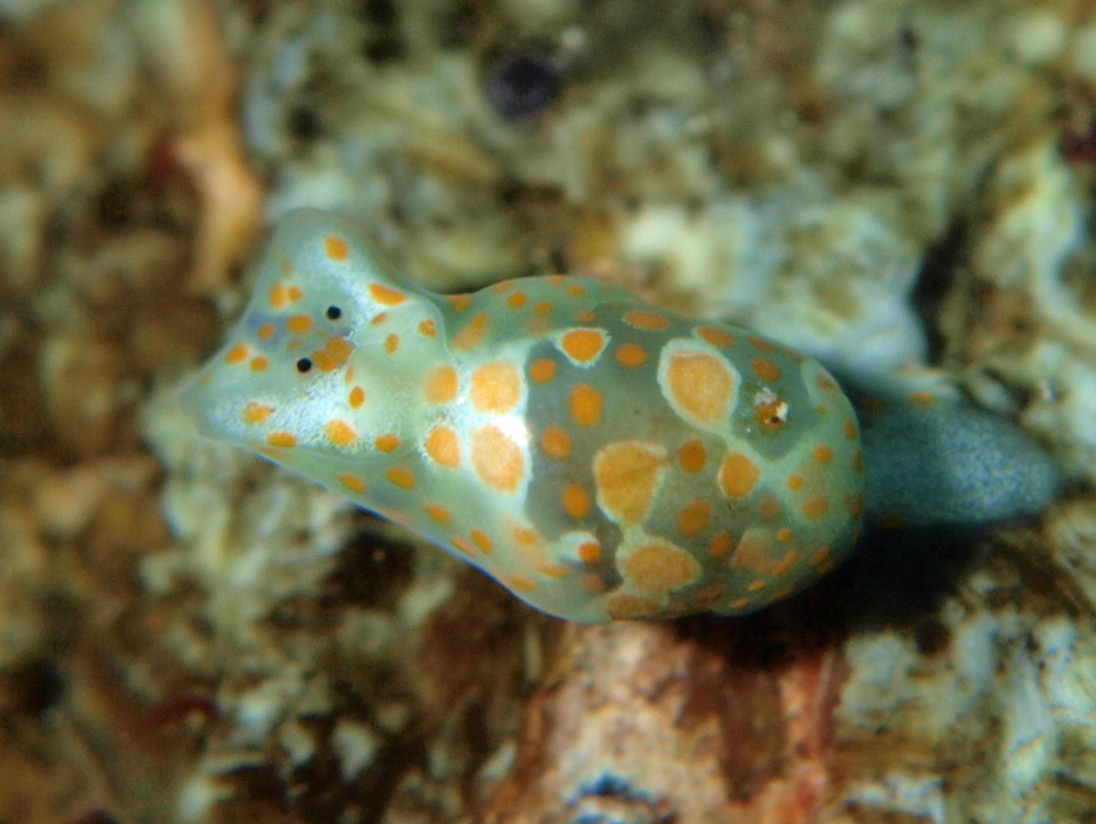 全長は1pほどで、頭部の小さな2黒点は眼ですが、ウミウシに共通して機能的には大したことがなく、ぼんやりと明かりが見える程度だそうです。