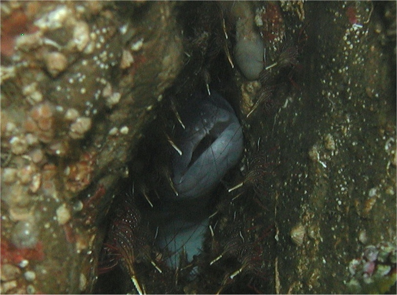 顔(というか口)だけが岩の裂け目に見えています。まわりをサラサエビがびっしりと取り囲んでいて、何がなんだかわからない状態ですが、ガイドさんが確信を持って「クロアナゴです」と宣言したので、ボクも確信を持って掲載します。