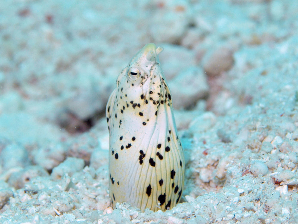 撮影 2010/10/20 沖縄県 石垣島 掲載 2015/05/03 ⇒ウツボ・アナゴの仲間 色は白っぽいものから黄色まで多くのバリエーションがあるそうですが、白っぽい方の個体が撮れたので追加しました。