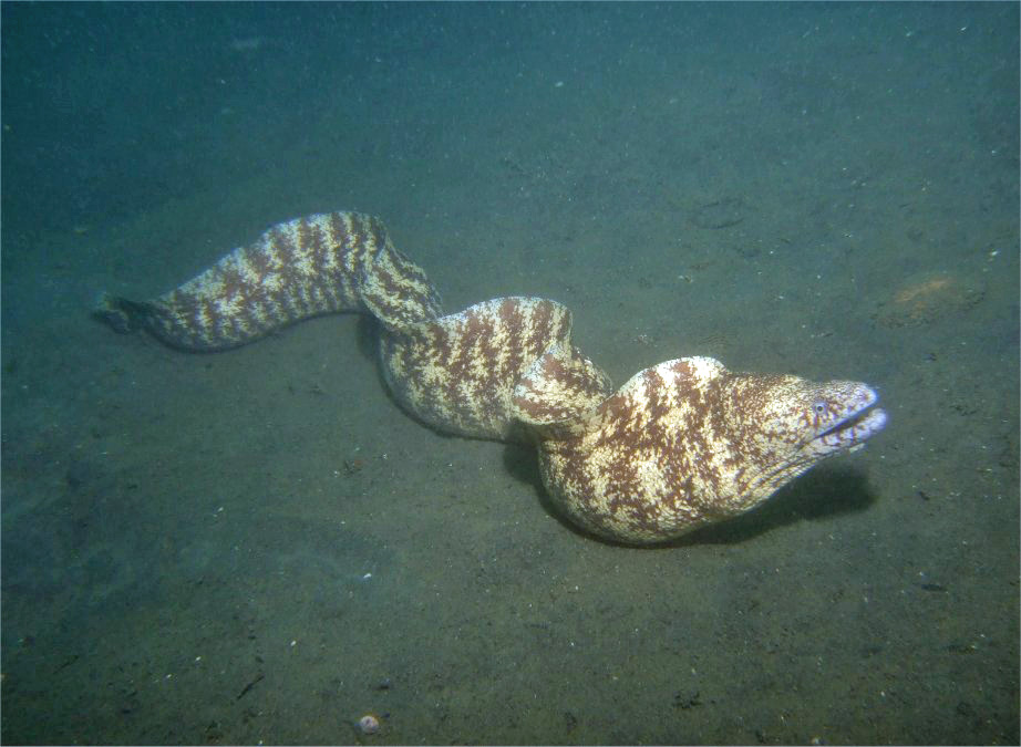 ふだん見かけるときはいつも岩の隙間から顔だけ出しているのに、どうしたわけか全身を曝してゆっくり移動していました。もしかしたら他のウツボとの場所取り争いに負けて、新しい住処を探していたのかなー。
