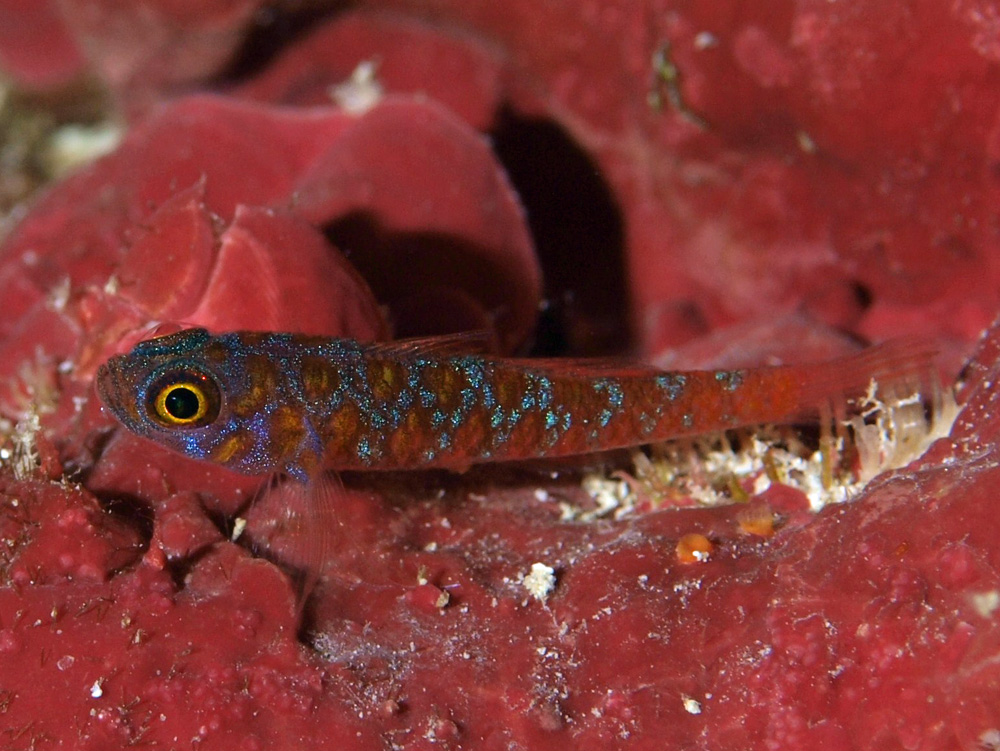 青いラメで着飾った豪華なハゼ。キラキラというか、ギラギラというか、ともかく輝いています。こんな写真が撮れてウレシイ。